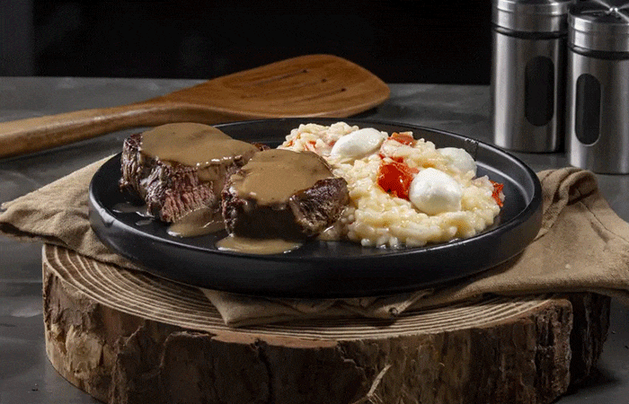 Risoto Caprese e Tomate Confitado, Medalhão de Filé Mignon ao Molho Madeira (300g)