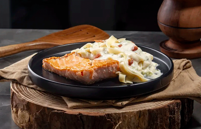 Salmão Grelhado e Talharim ao Molho Branco com Bacon e Brócolis (300g)