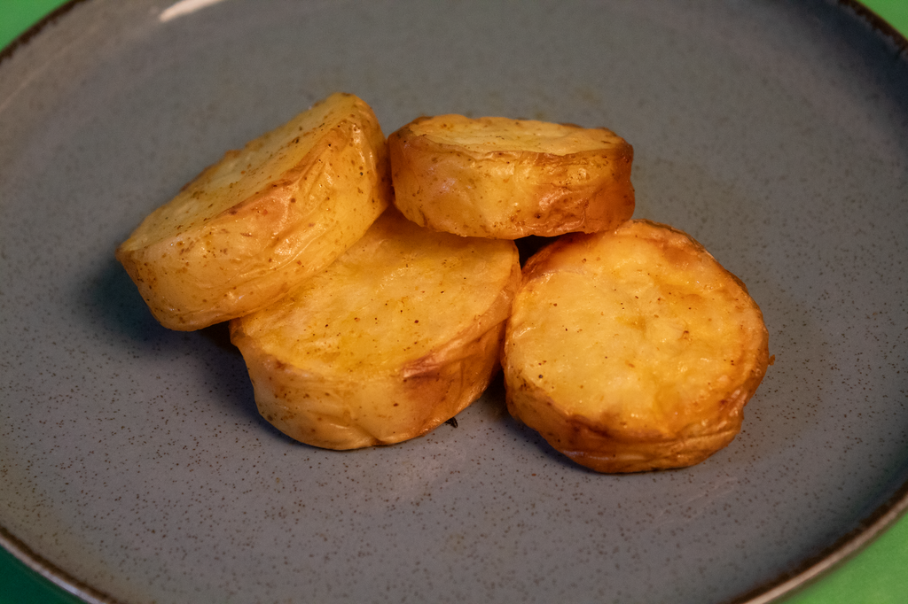 - Batata Assada em Rodelas com casca regada com azeite e temperada com páprica e alecrim