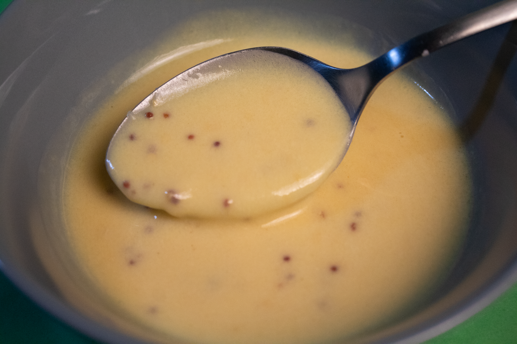 - Molho a base de creme de leite feito com mostarda em grãos e mostarda pronta