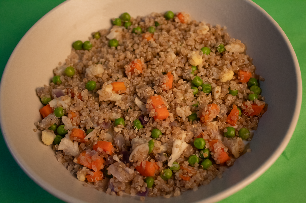 - Quinoa refogada com cebola roxa e ervilhas frescas