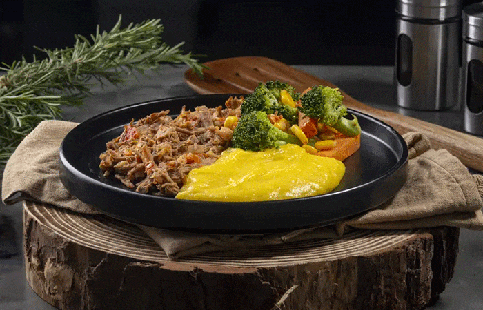 Carne Desfiada, Purê de Mandioquinha, Milho, Cenoura e Brócolis