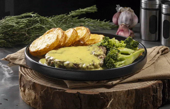 - 1x Hambúrguer de Fraldinha ao Molho de Mostarda, Batata em Rodela com Alho e Brócolis