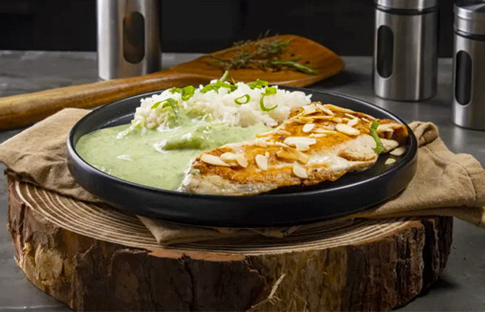 Tilápia com Ervas e Amêndoas, Creme de Espinafre e Arroz Jasmine com Cebolinho