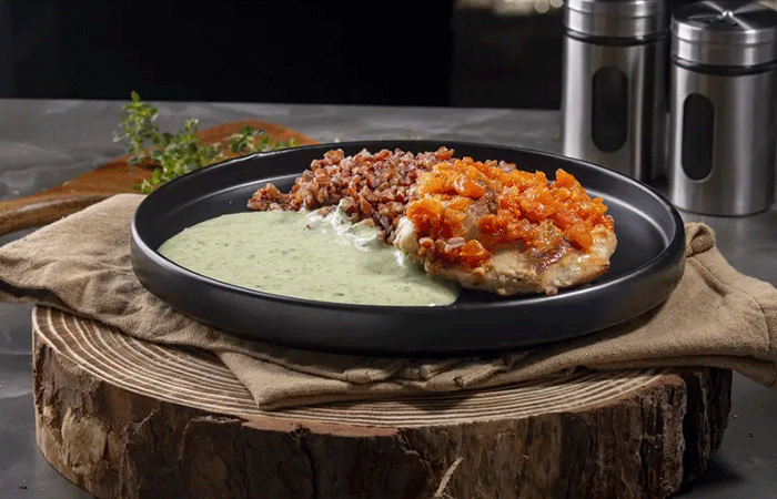 - 1x Frango Recheado com Queijo, Creme de Espinafre e Arroz Vermelho