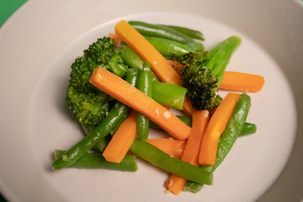 - Mix de Legumes salteado adicionando cor e textura ao prato com cenoura brócolis e vagem